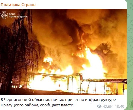 В Черниговской области ночью прилёт по инфраструктуре Прилуцкого района. Фото: Скриншот Telegram/"Политика Страны"