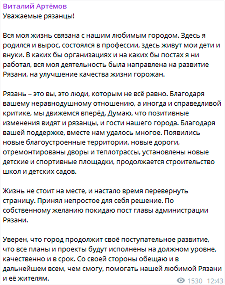 Пост мэра Рязани об отставке в ТГ-канале, скриншот страницы