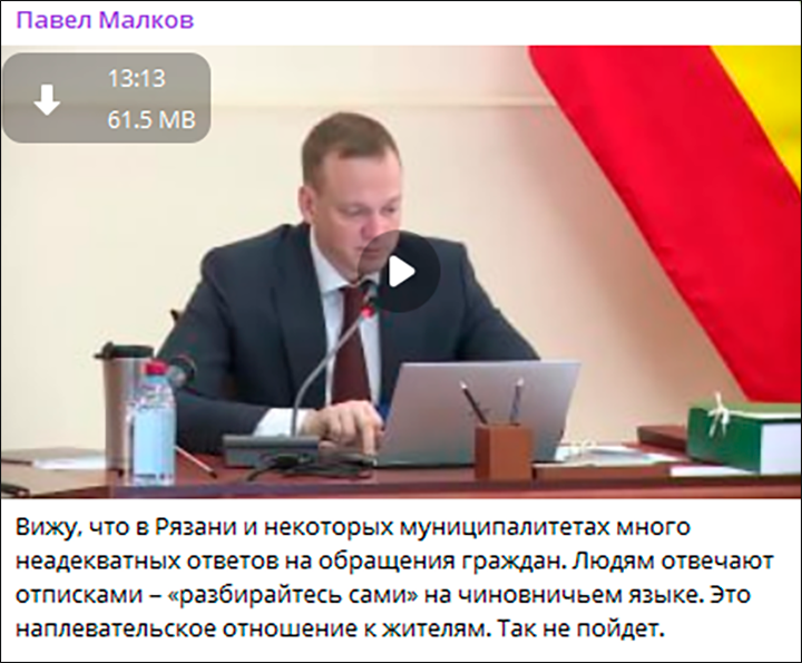 Пост губернатора Павла Малкова в ТГ-канале о плохой работе рязанских чиновников, скриншот страницы