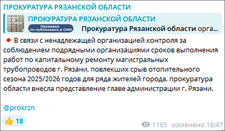 Прокуратура выносит представление мэру Рязани за срыв начала отопительного сезона, ТГ-канал ведомства, скриншот страницы