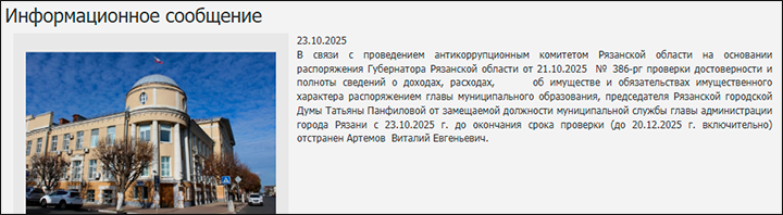 Сообщение городской Думы об отстранении от должности Виталия Артёмова, сайт rgdrzn.ru, скриншот страницы