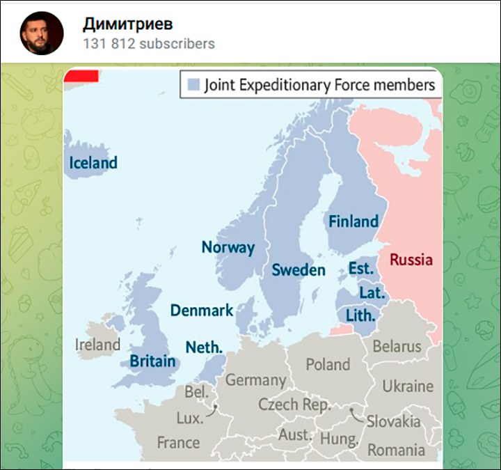 Страны JEF имеют колоссальные возможности по блокированию нашего судоходства в северных морях и ждут только создания подходящих для этих операций военных инструментов. Скриншот: ТГ-канал "Димитриев"
