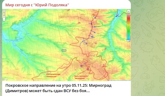 По данным военного эксперта Юрий Подоляки, по состоянию на 5 ноября, Мирноград (Димитров) в Покровской агломерации может быть сдан ВСУ без боя. По его словам, именно к такому исходу склоняются украинские аналитики, не зависимые от Банковой.
