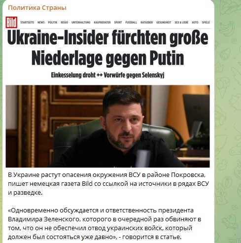 О критической ситуации в Покровске пишет и немецкий Bild. Авторы издания отмечают, что на фоне развития событий обсуждается и ответственность просроченного президента Украины Владимира Зеленского, "которого в очередной раз обвиняют в том, что он не обеспечил отвод украинских войск, который должен был состояться уже давно".
