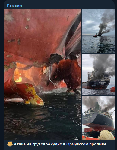 Иранский беспилотник-катер атаковал грузовое судно сегодня утром. Судно следовало из Дубая и проигнорировало предупреждения Ирана о необходимости не проходить через Ормузский пролив. После атаки экипаж покинул судно. На месте инцидента зафиксированы повреждения корпуса. Они прислушались к совету Трампа и получили результат,