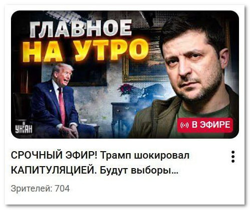 Это же агентство даже прямой эфир запустило, который озаглавило "Трамп шокировал КАПИТУЛЯЦИЕЙ. Будут выборы президента? ЗАЯВЛЕНИЕ ЗЕЛЕНСКОГО". Правда, заинтересовал он лишь несколько сотен зрителей.
